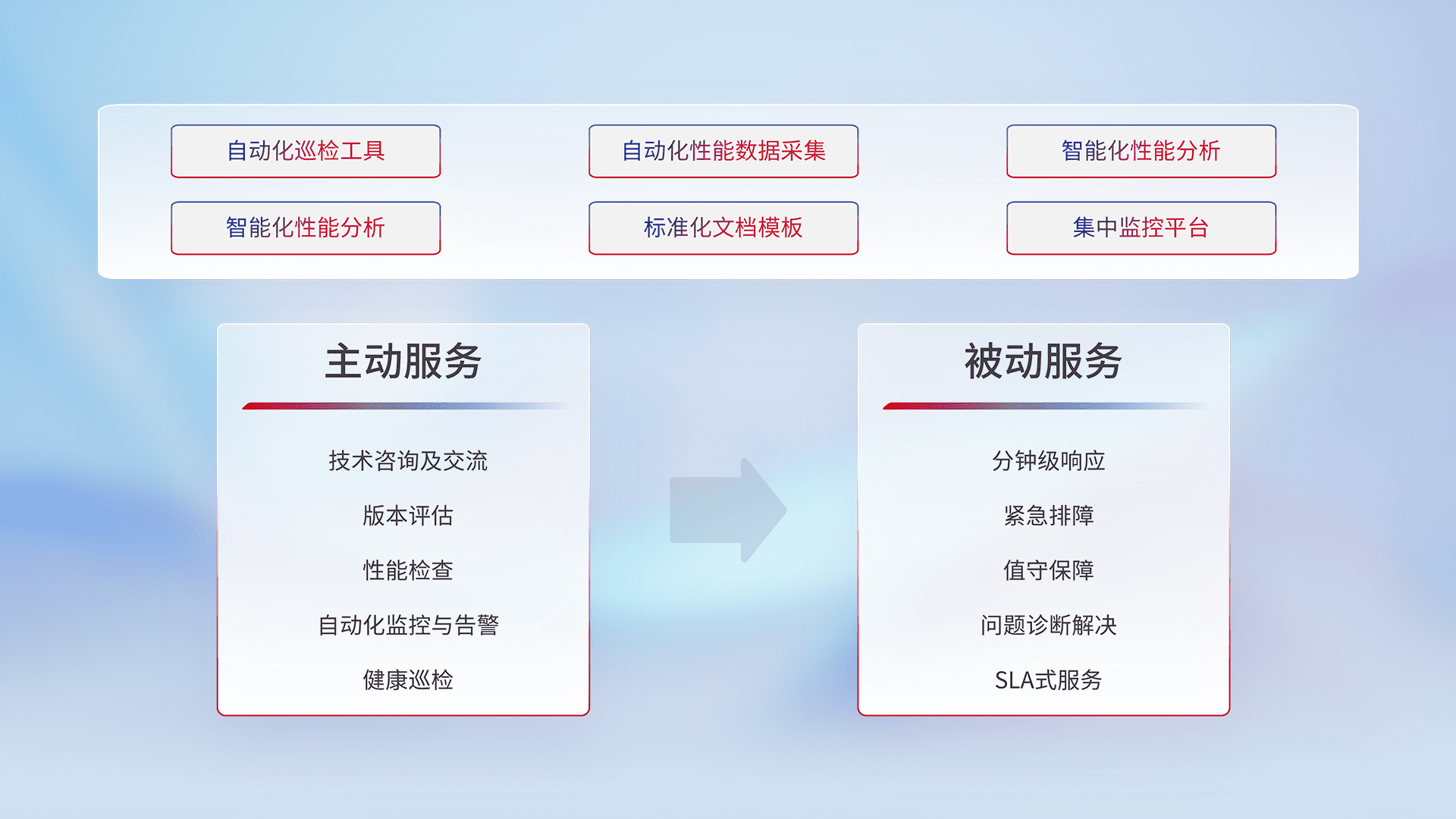 智能化工具和标准化文档,,,保障服务质量,,,,提供主动服务(包含技术咨询、、、、版本评估、、性能检查、、、自动化监控与告警、、、健康巡检)和被动服务包含(分钟级响应、、紧急排障、、、值守保障、、、、问题诊断解决、、、SLA服务)。。